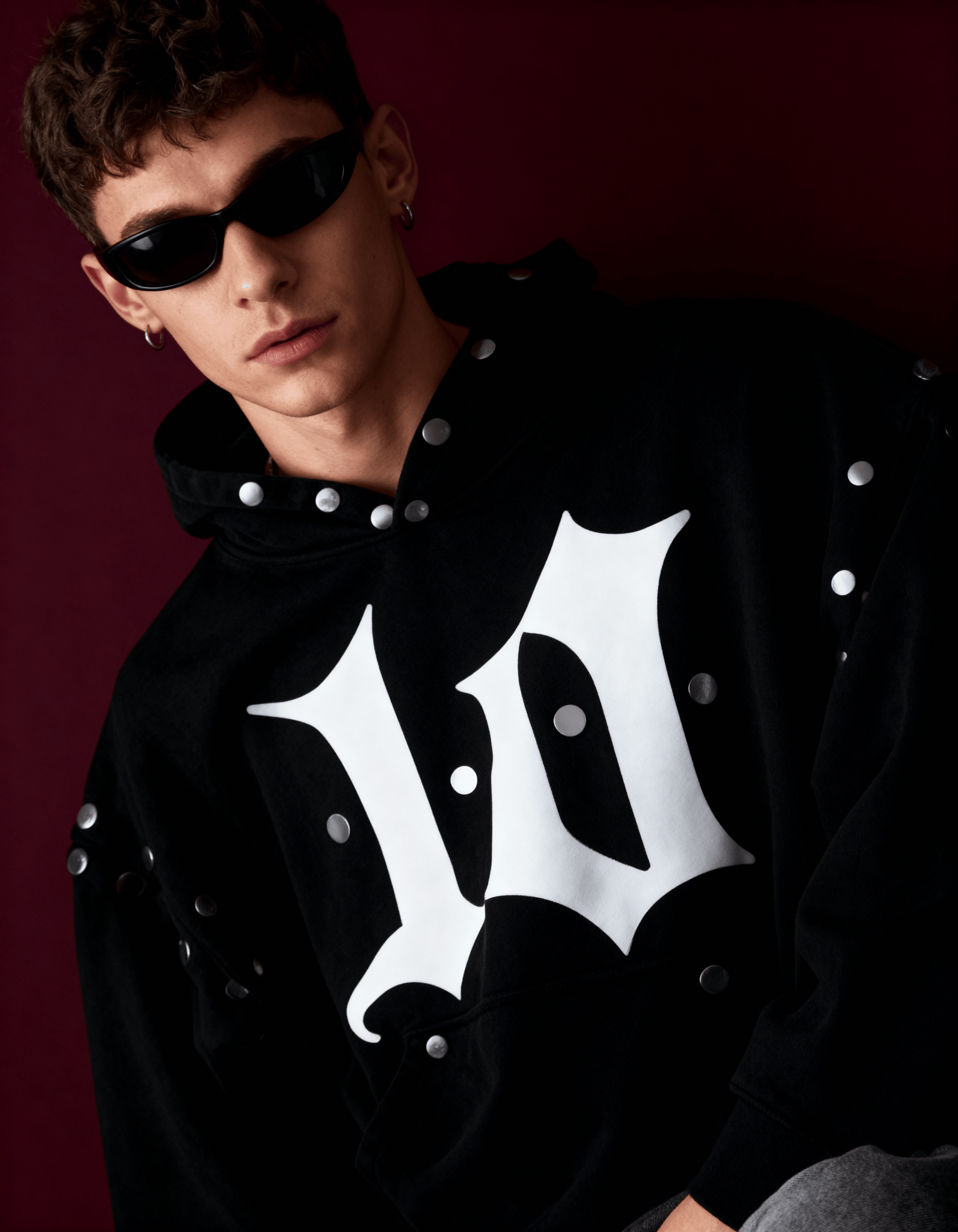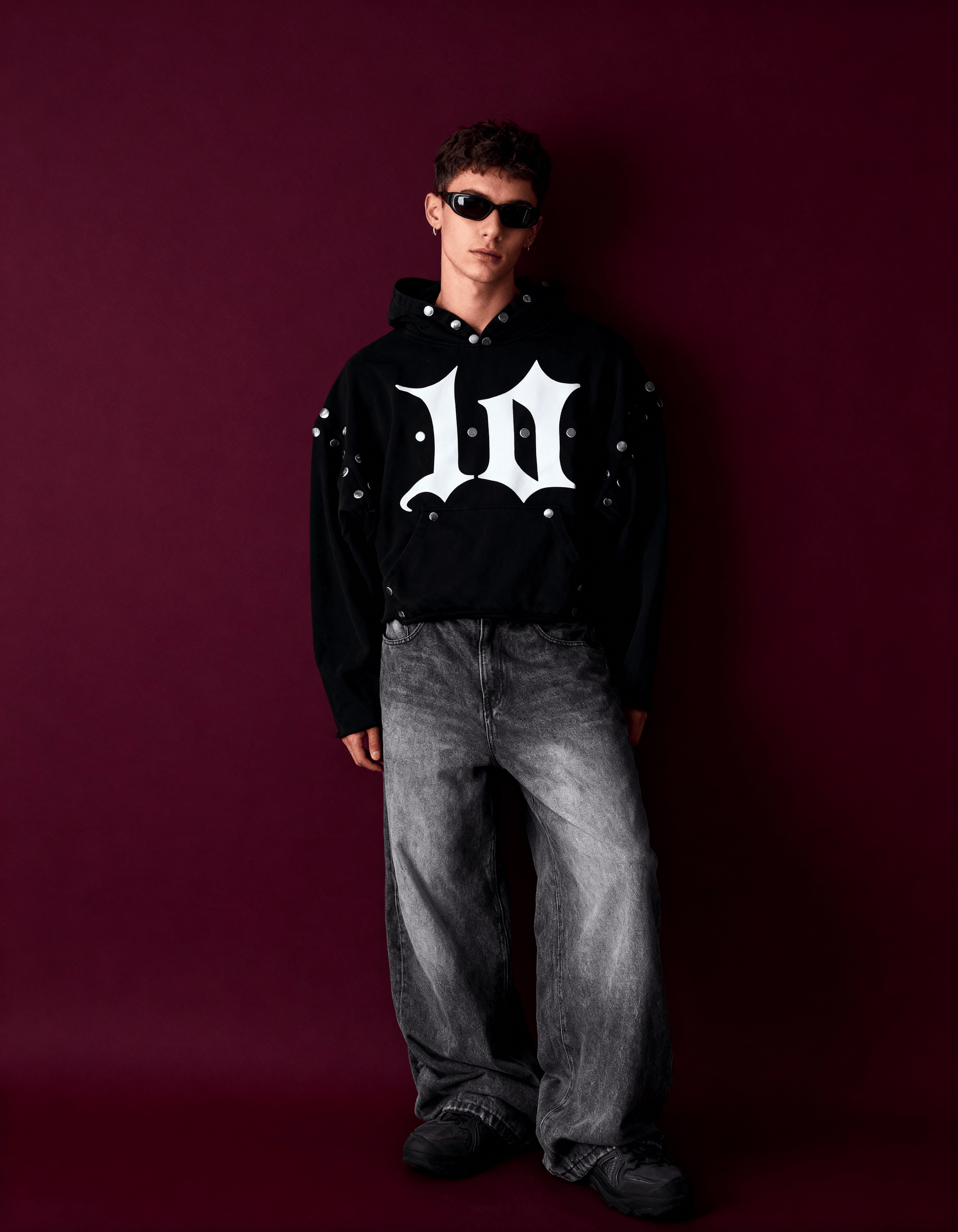 Crafted in premium 350 GSM heavyweight terry cotton, this oversized hoodie brings a bold streetwear edge with its large gothic screen print at the front. Designed with a cropped fit, metallic rivet details, and a structured hood, it combines rugged aesthetics with everyday comfort.