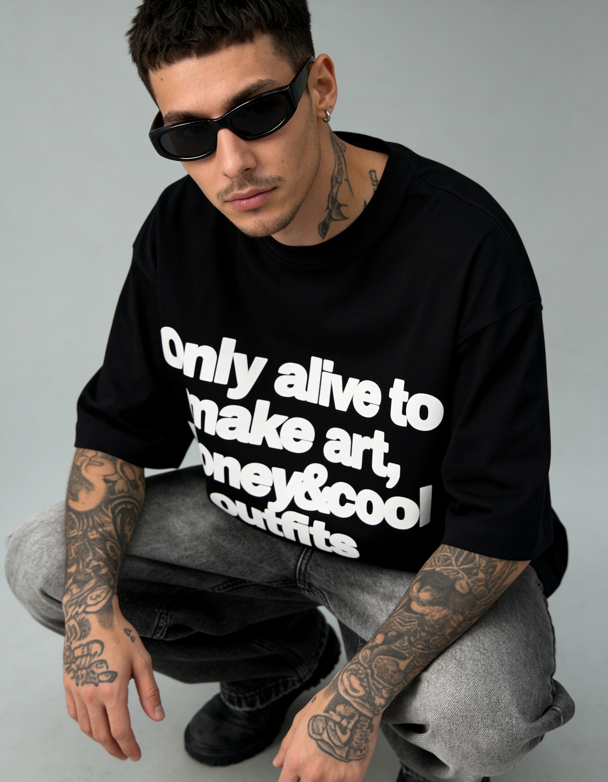 Oversized black graphic t-shirt for creators. Premium cotton comfort, bold streetwear statement, and relaxed fit perfect for everyday styling with denim or cargos.